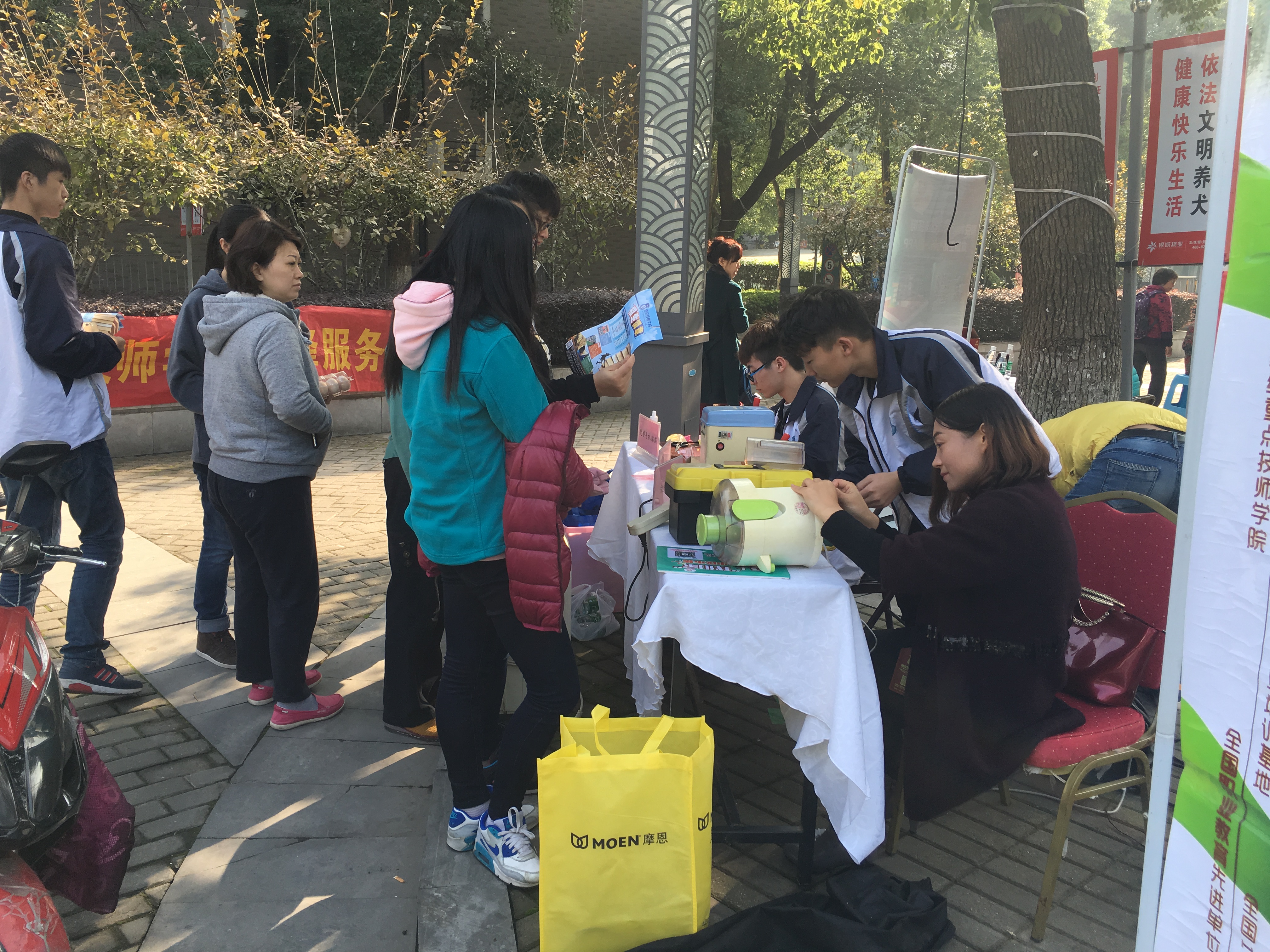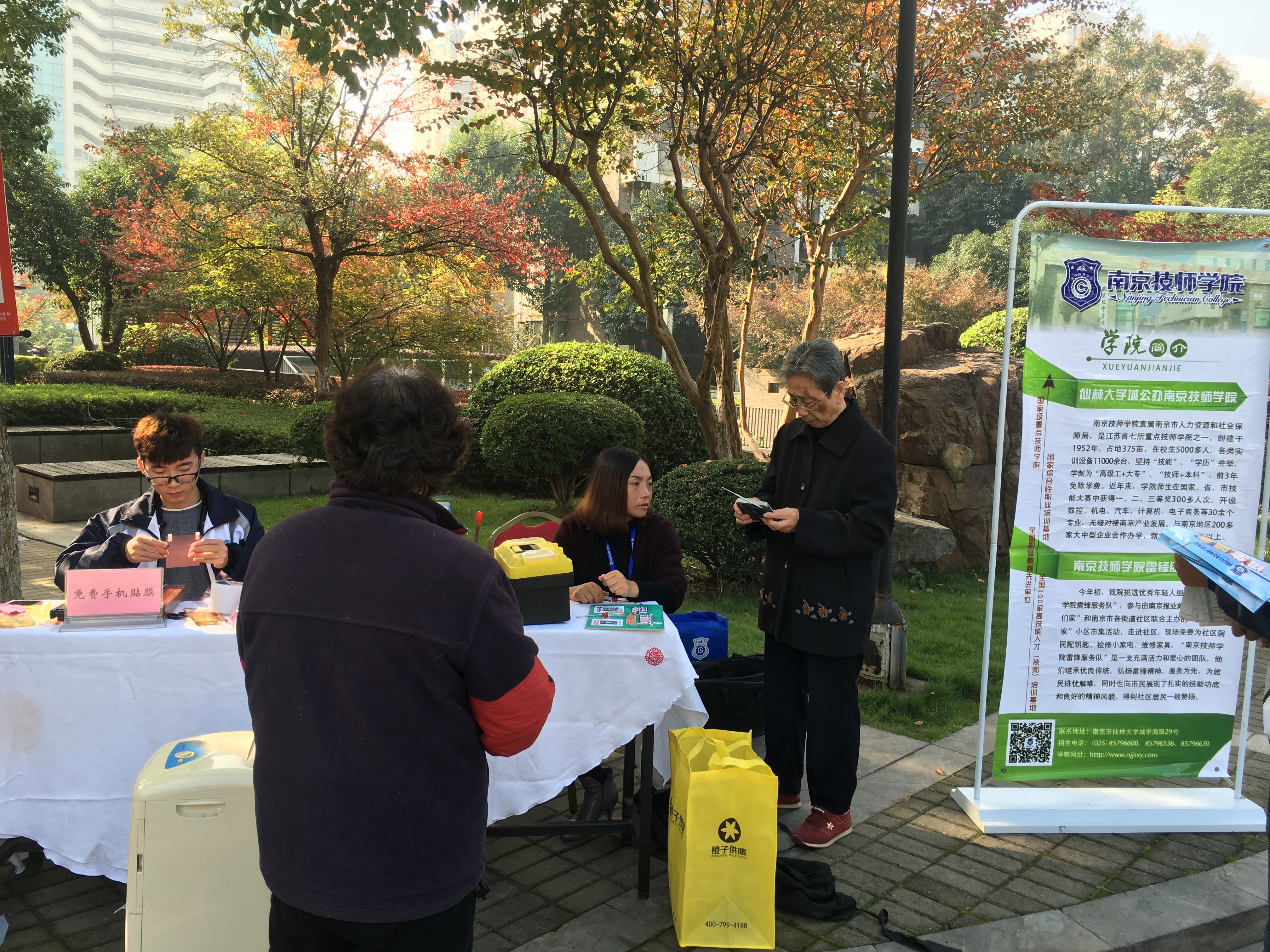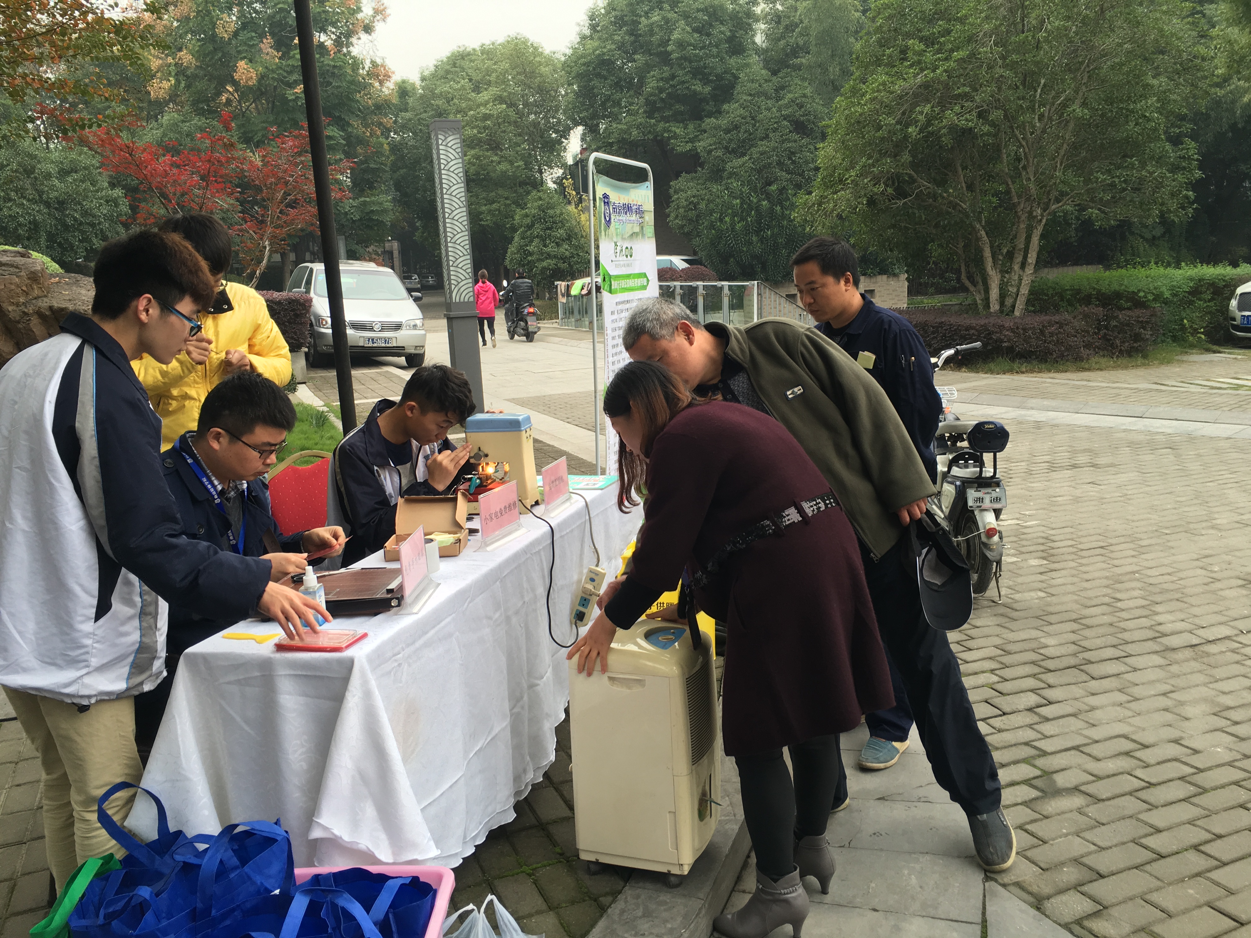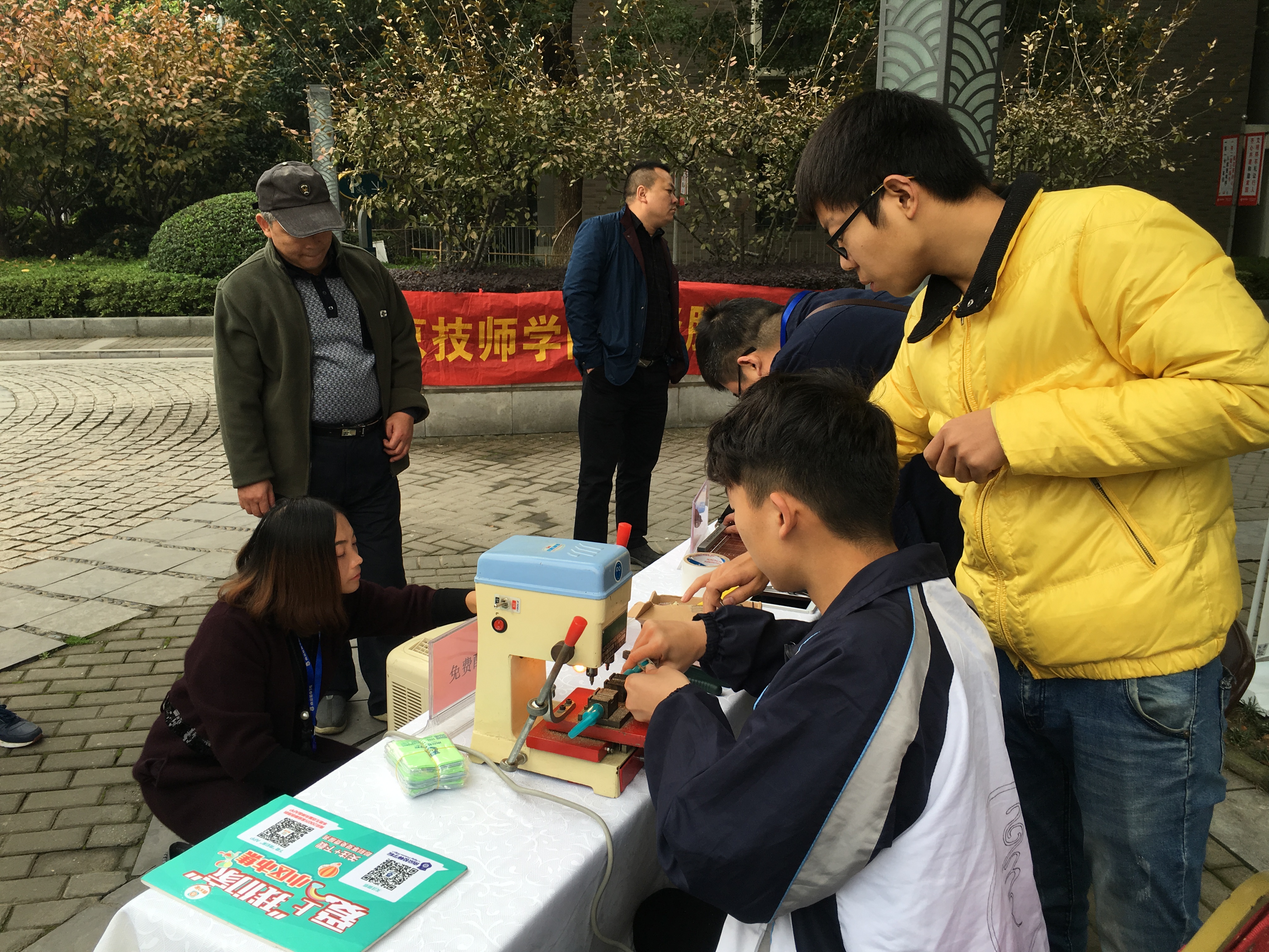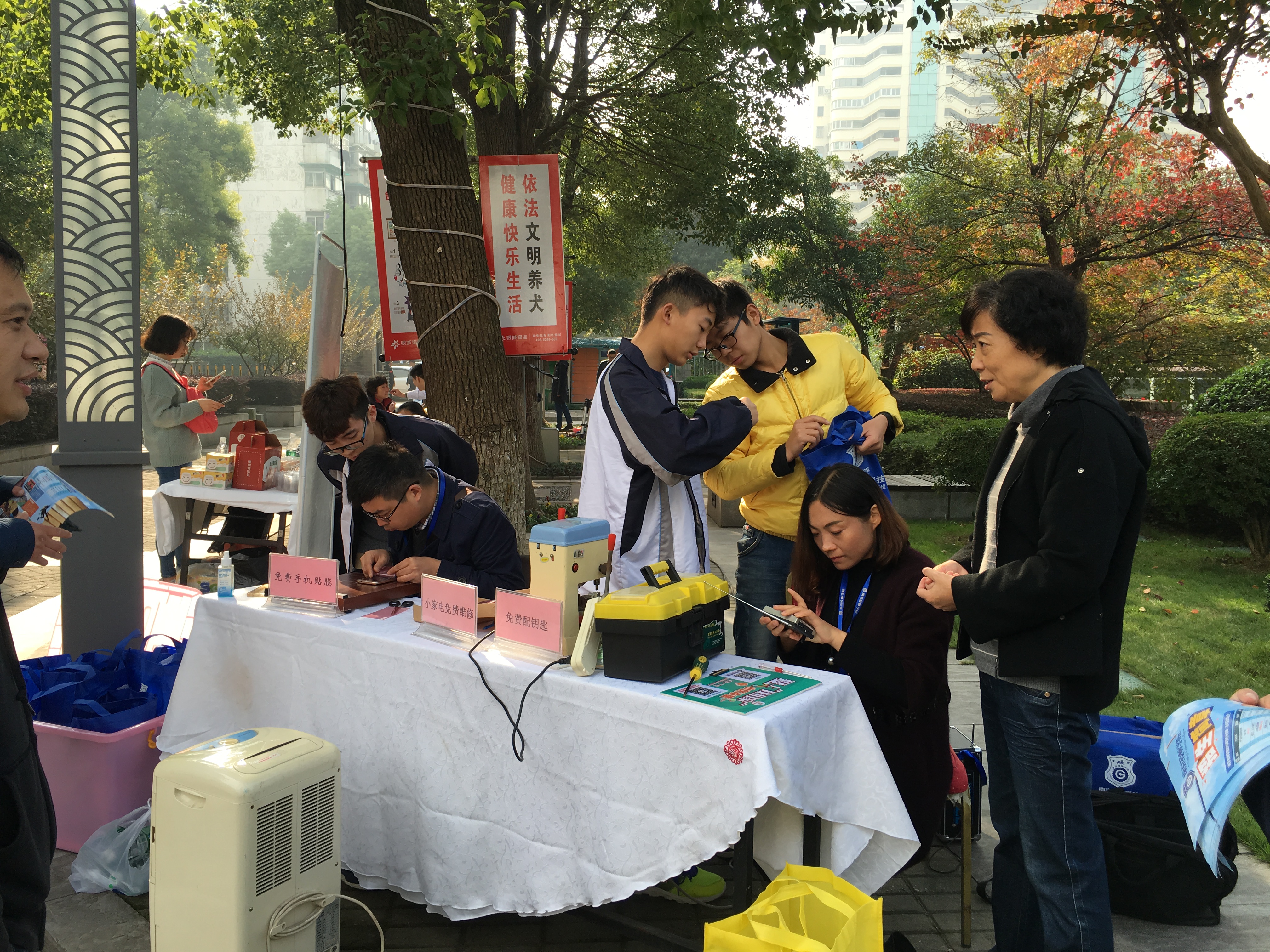 活动现场,志愿队的同学们带来了各式各样、大包小包的工具,撸起袖子不遗余力地为社区居民免费服务。负责贴手机膜的同学面前排满了长队,有些居民带着自己的iPad,请我院专业贴膜小能手帮忙贴膜。配制钥匙的机器也轰隆隆地忙碌了一整天,小区居民们反映,地下车库的钥匙很难配到,我院服务队正好能解决此难题,所以大家纷纷拿出钥匙希望抓住这个机会多配几把备用。小家电服务也围满了居民,修收音机、电水壶、除湿机的居民络绎不绝。