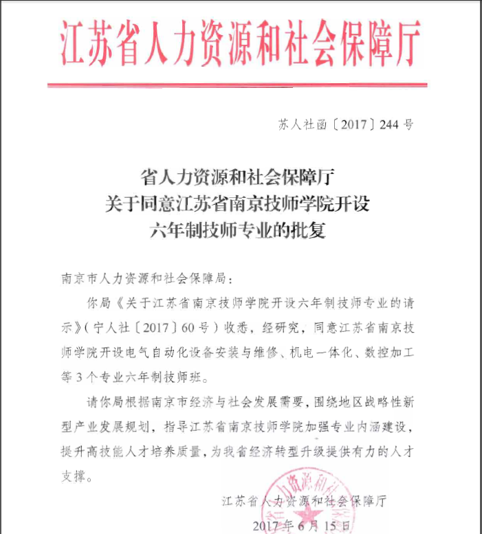 我院接到《省人力资源和社会保障厅关于同意江苏省开云手机站登入开设六年制技师专业的批复》(苏人社函[2017]244号),同意开设电气自动化设备安装与维修、机电一体化、数控加工等3个专业。