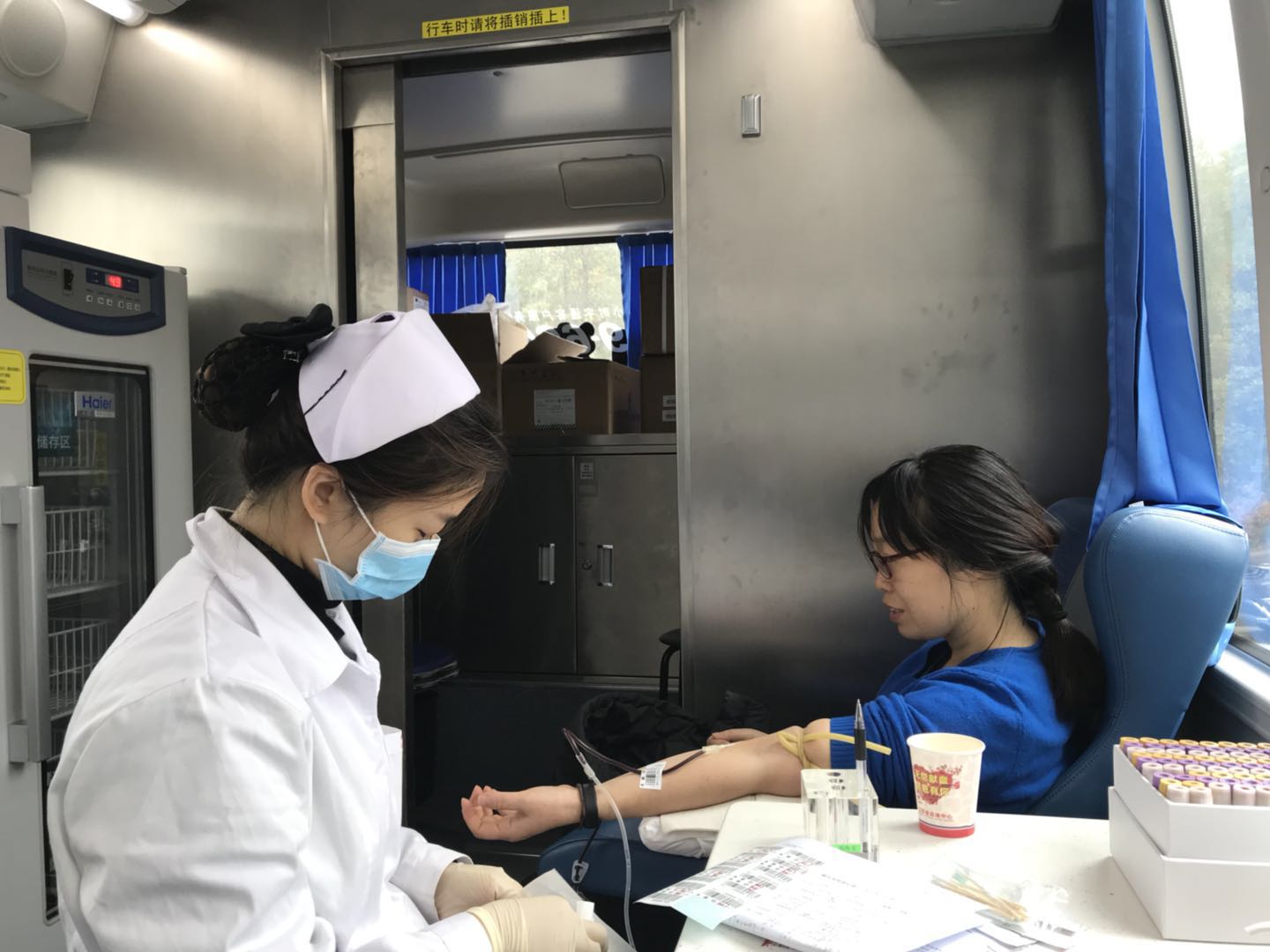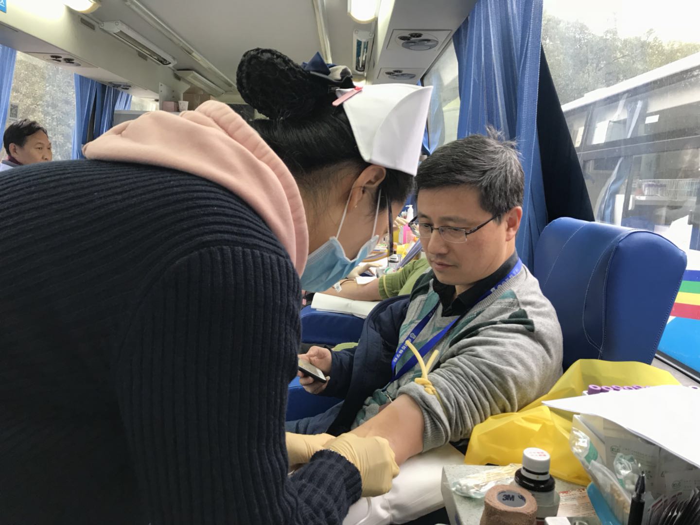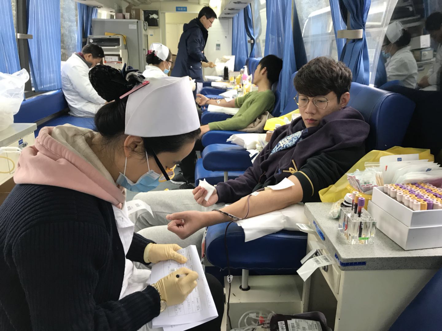 在献血活动现场,参与献血的教工按照医生的要求认真填写献血单、进行血样化验,并开始献血,一袋袋鲜红的热血流露着我院教职员工高尚的道德情操和志愿服务精神,真正体现了他们用血液凝聚爱心,用品行体现真情,以实际行动践行无私奉献的当代社会主义核心价值观。