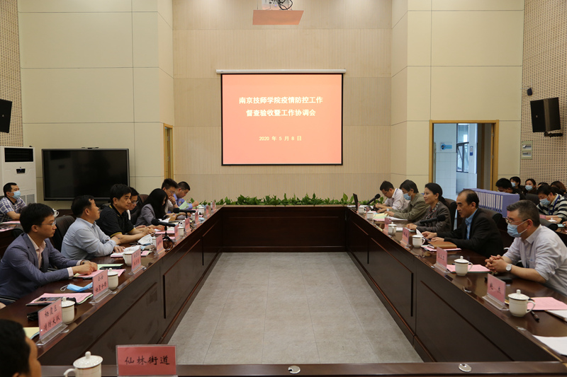5月8日,仙林大学城管委会副巡视员盖立伟、栖霞区人社局副局长梅华等领导率栖霞区疫情防控工作督查验收工作组一行来我院验收开学前准备工作。院党委书记张金梅,院长侯放,副院长王杭贵、金卫卫、朱胜强、赵杰,以及相关部门主要负责人陪同。
