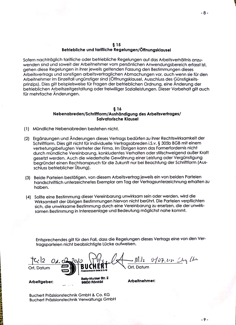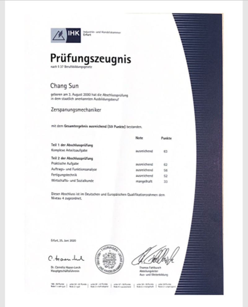 此次IHK考试中,陈世强同学的成绩远胜德国学生。并且在德实习期间,他的工作表现得到了实习企业Buchert精密技术公司(Buchert Präzissionstechnik)的老板Buchert先生的赞许,目前他已与该企业签订正式劳动合同,在德国开启了新的人生。