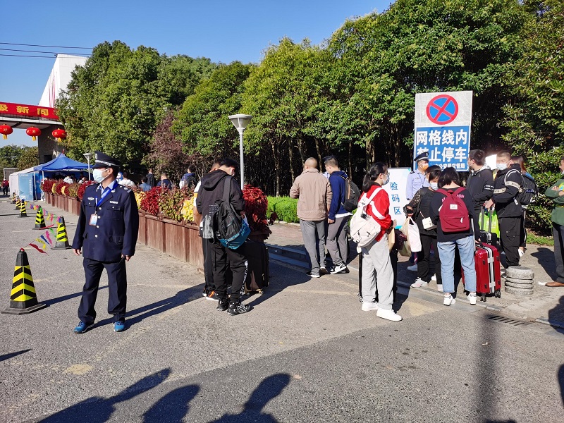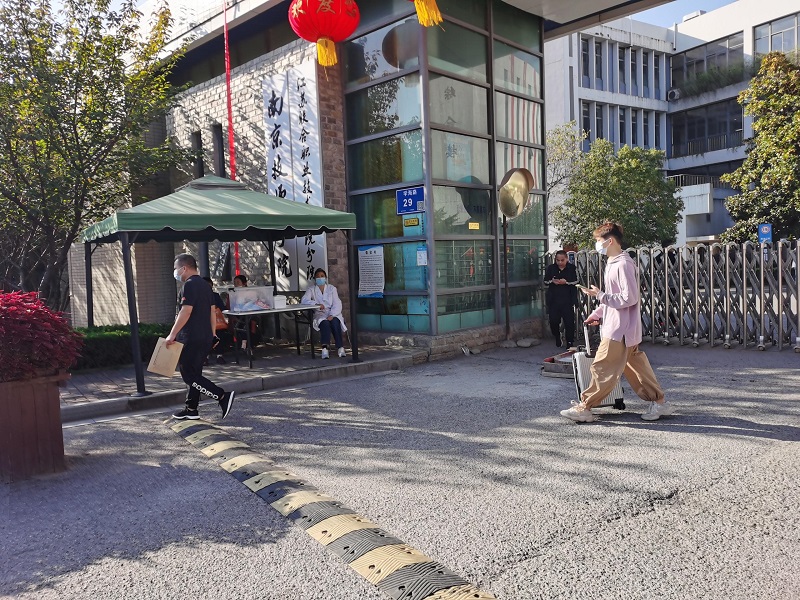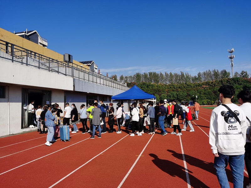 落实疫情防控常态化要求,新生及其家长们经过校门口查验“苏康码”、严格测温、佩戴口罩后有序地进入校园。