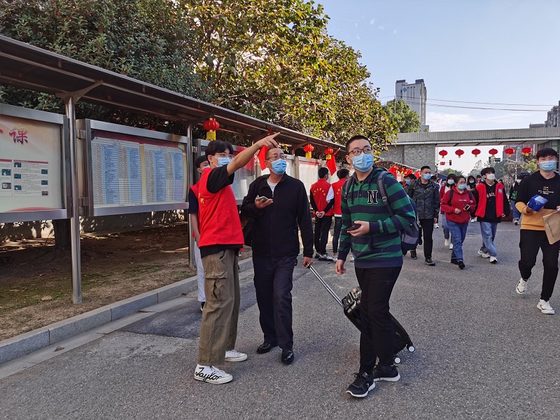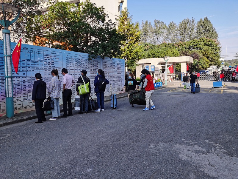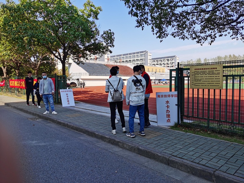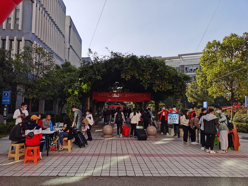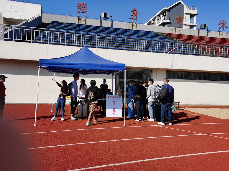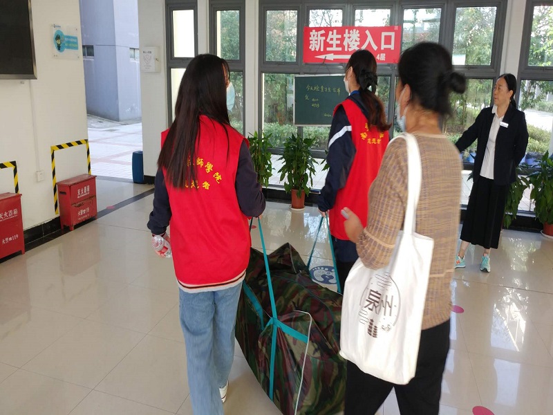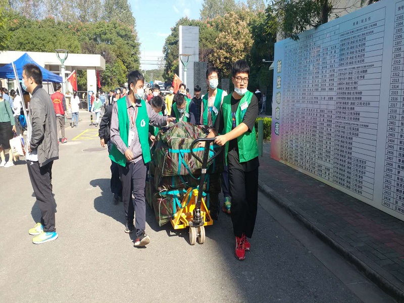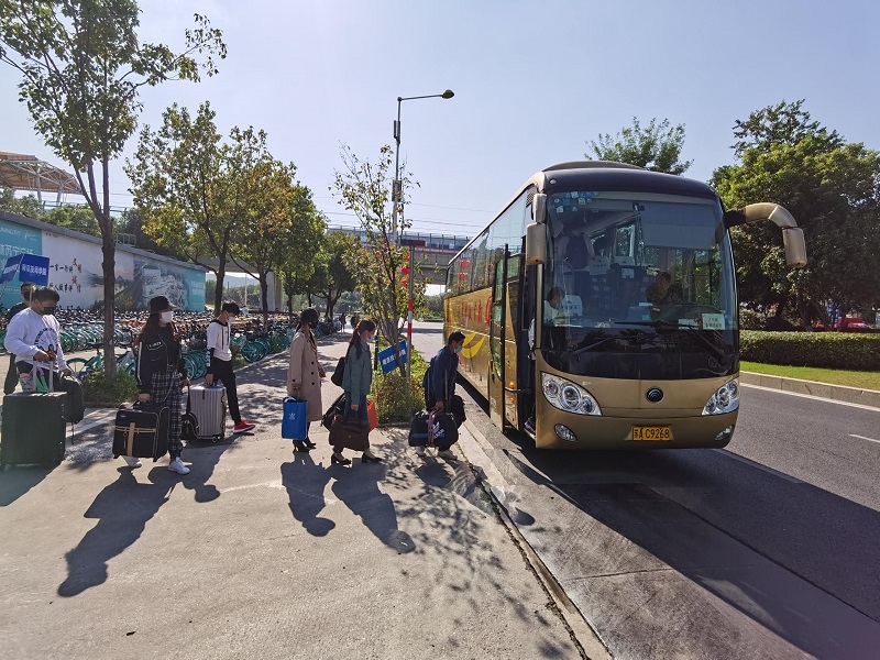 学院实行全天报到,迎新当天,学院安排了校车在地铁站接站新生。