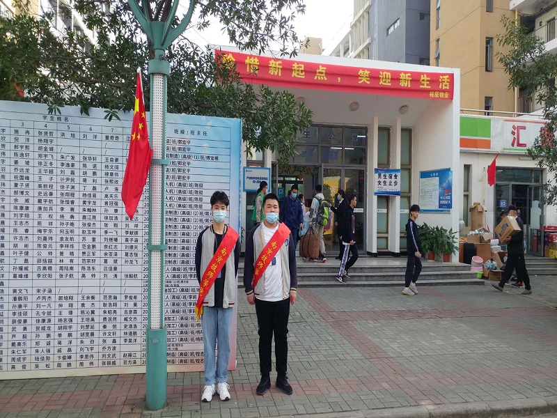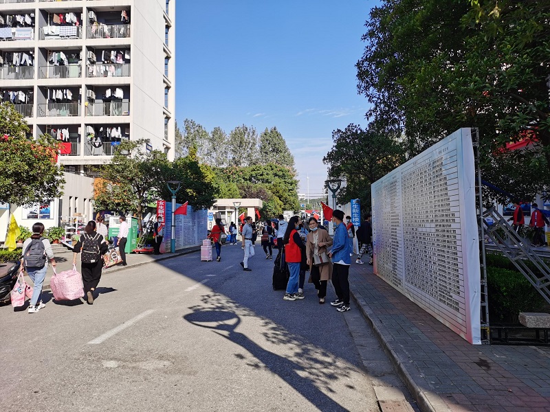 宿舍安排了新生接待点,宿舍门口张贴了新生住宿安排表,方便新生及家长迅速找到住宿位置,现场志愿者和老师、物业都很热情欢迎新生及家长。