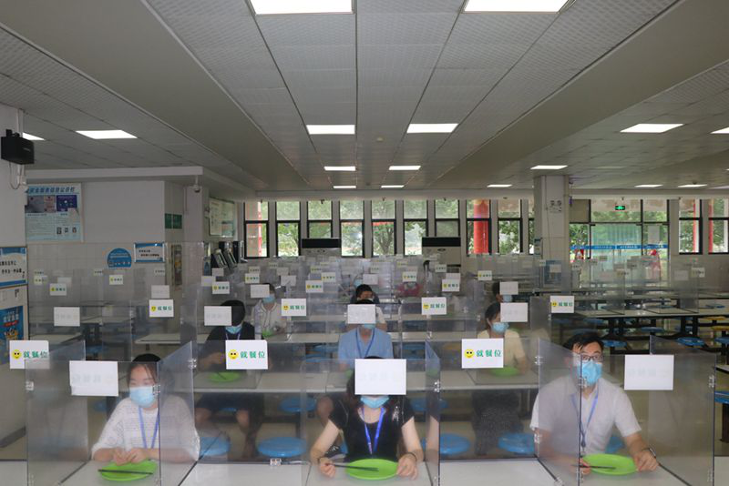 在学生就餐场景演练中,模拟学生进入食堂就餐到用餐结束离开食堂的全过程。分散下课铃声响后,学生陆续进入食堂,他们就餐前先自行洗手,在学生志愿者引导下,间距1米有序进入食堂。进入食堂大厅后按地面指示图标排队至窗口,打餐后到座位间隔就餐,结束用餐后将餐盘放置倒残处回收,从出口有序离开。
