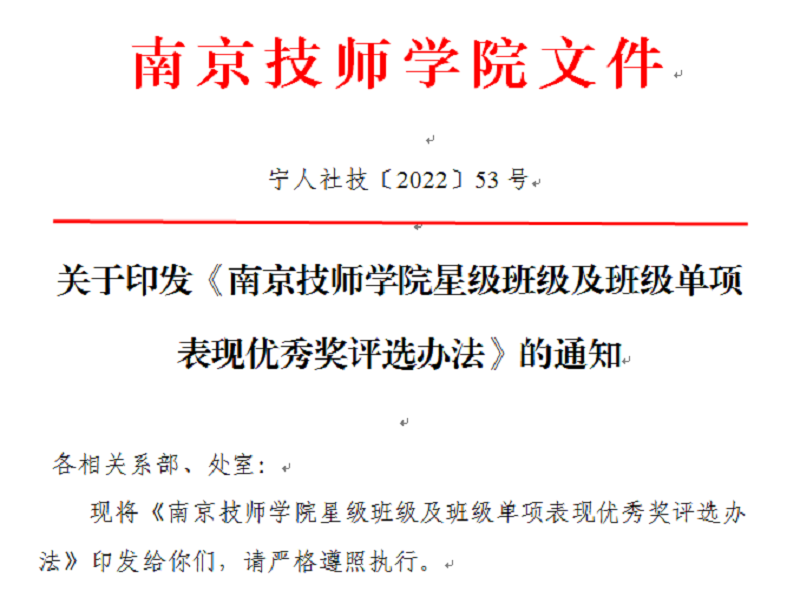 同时,为了更好地贯彻党的教育方针,进一步加强我院校风和学风建设,提高班级自我管理水平,充分发挥先进典型的示范引领和价值导向作用,调动班主任和全体学生争先创优的积极性,学工处牵头制订并上会通过了《开云手机站登入星级班级及班级单项表现优秀奖评选办法》(宁人社技﹝2022﹞53号)和《开云手机站登入班主任及班级考核办法》(宁人社技﹝2022﹞57号)。今后,学工处和各系部将加强班主任及班级管理力度,促进学生形成良好的行为习惯、学习习惯,提升道德素养,进一步提高我院学生管理水平。