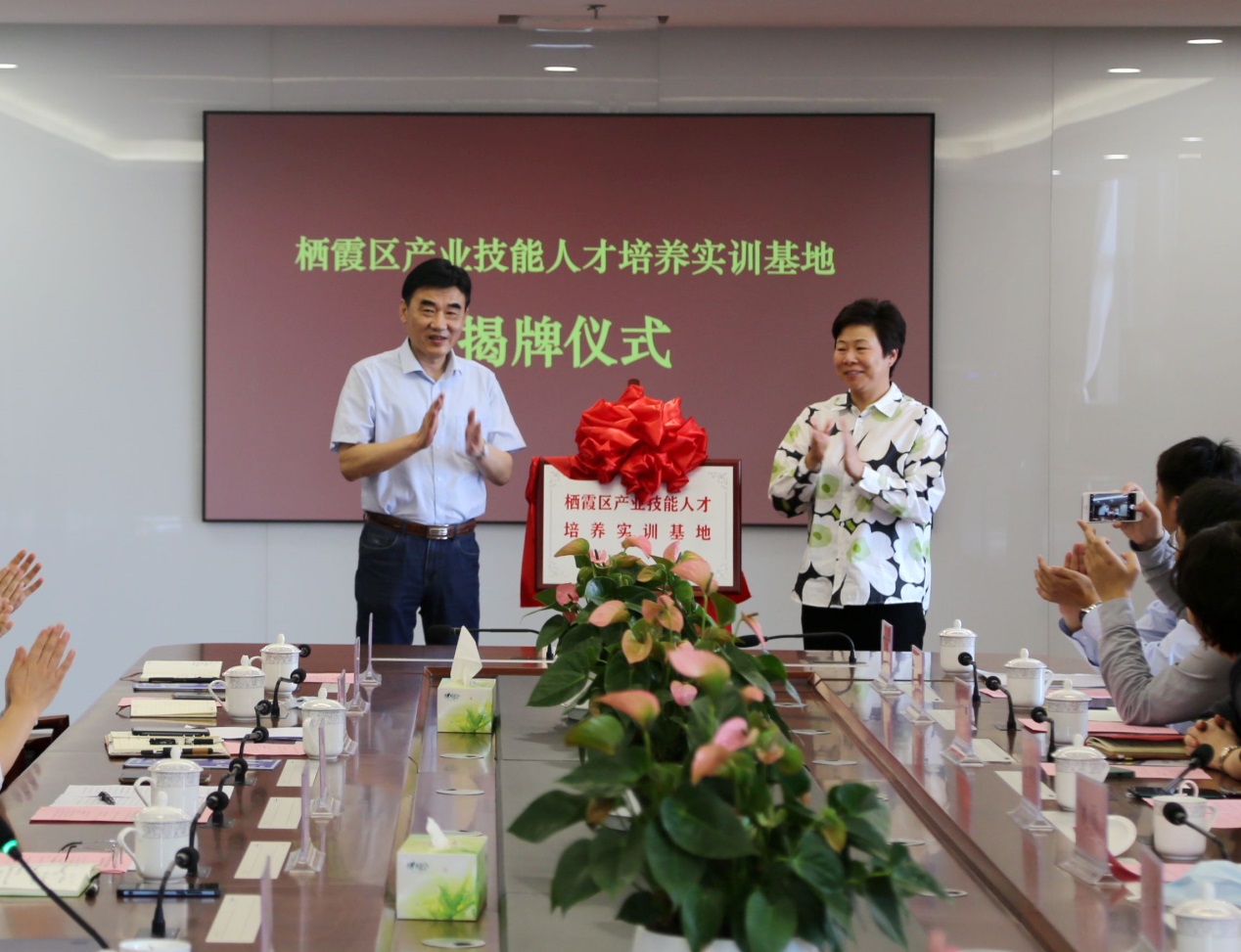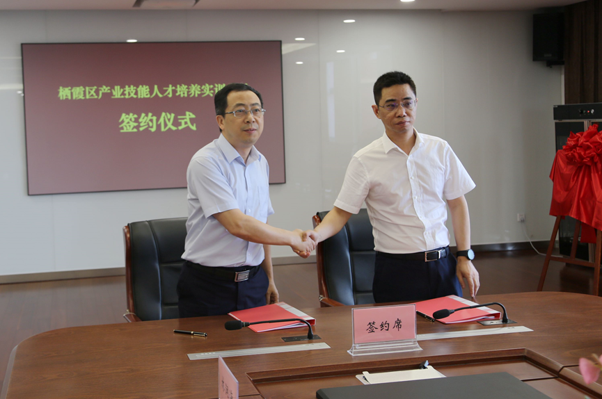 会上,区人社局与学院共同为栖霞区产业技能人才培养实训基地揭牌双方签订了校地合作协议。