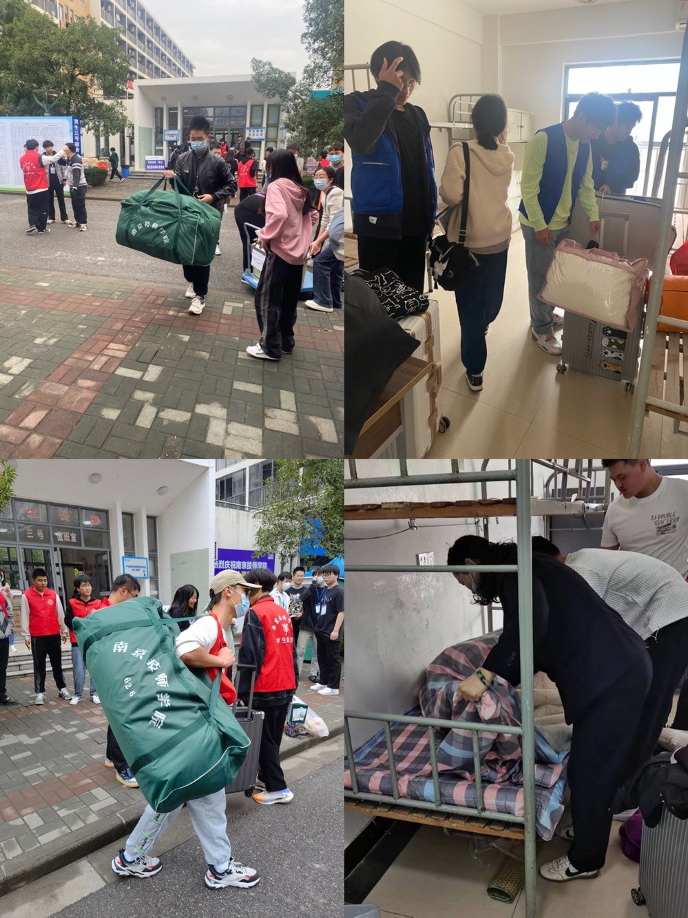 本次迎新家长不可陪同新生进入校园各系部召集迎新志愿者与志愿教师,偕同院学生会志愿者,在东北门、东南门、各系部教学楼下宿舍楼等区域提供志愿服务。志愿者一对一服务,依次引导新生到达教学楼区域完成报到帮助新生学弟学妹拿行李的同时为他们介绍教学楼、宿舍、食堂等区域,并帮助新生行李搬上宿舍楼,宿管阿姨帮助新生整理被褥。整个过程分工明确有条不紊,志愿者们的耐心服务获得一致好评。