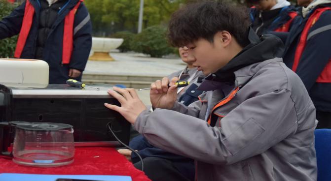 活动伊始,看见志愿者在放好螺丝刀、维修器件工具,吸引了大部分的同学前来咨询,部分同学手拿电风扇、咖啡机、加湿器等有故障的器件,志愿者们相互配合,充分发挥自己专业的能力,仅仅有条的对故障的电气展开维修如电路检测、维修损坏的零件等。针对这些电路的故障,志愿者们细心指导同学们如何检查和排除损坏的故障并对安全用电的相关知识有一定的了解,正如人们常说的“安全在我心,防患无处存”。同学们拿着修好的器件,脸上露出了灿烂的笑容。其他志愿者手持着扫帚和工具等,对活动场地进行了清扫工作。他们分工明确,经过他们的努力,让环境一尘不染。