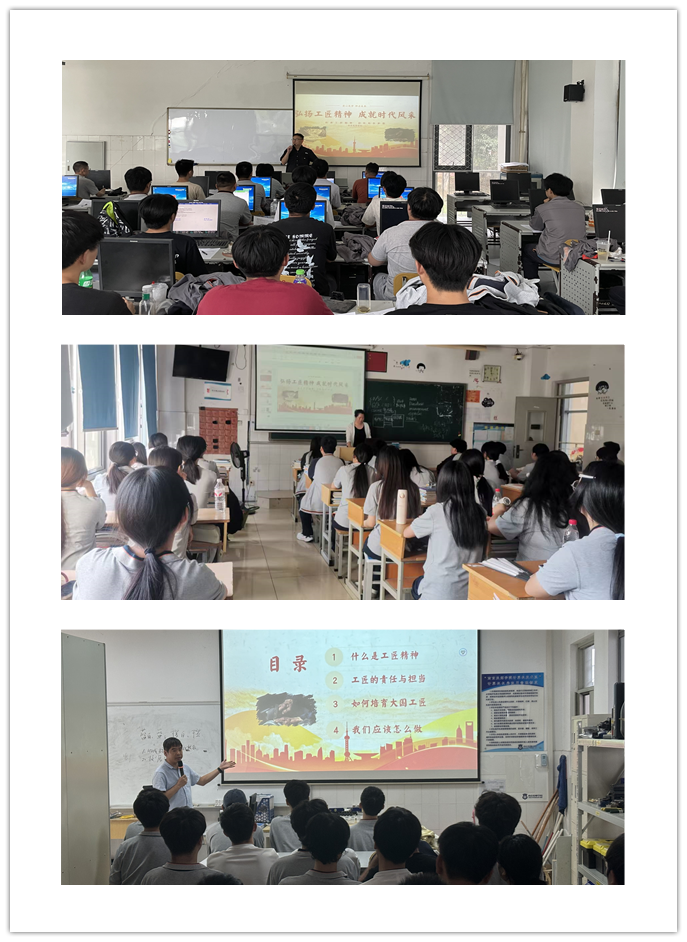 随后,各班级围绕“弘扬工匠精神,成就时代风采”主题开展班会。班会上,老师们通过生动案例,详细阐释了工匠精神“执着专注、精益求精、一丝不苟、追求卓越”的内涵,强调工匠精神是从业者对职业的敬畏热爱、对产品的精雕细琢、对技术的不断钻研。